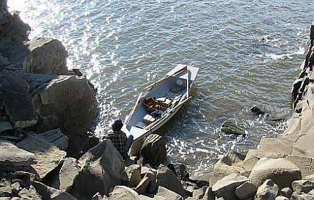 It was downwind and the wind was rising a bit so off we went. I hitched a ride with George Fulk on his Mayfly16. (Hey, George was working in the Peace Corp in Chile when they had the big revolution/military coup but luckily he didn't "disappear" like some of his fellows...)