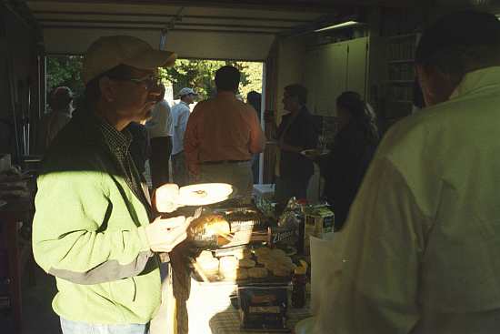 Wake up. Mike's large work shop is the meeting place for everyone but first another feed! Chuck and Sandra Leinweber of Duckworks have driven up from Texas. That is Chuck above on autofeed. More chatting and then down to the ramp, within an easy walking distance, to see the spread with new arrivals.