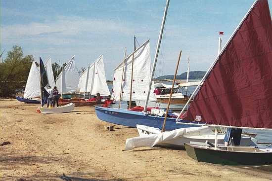 These boats have proven to be good for sail rig tinkerers (be sure to read and apply the Sail Area Math essay before starting). Here I am in Piccup with a polytarp sharpie sprit sail. The rig is different from the originals but the hull here is totally unchanged (except for paint) from the original shown on the beach at Pensacola.