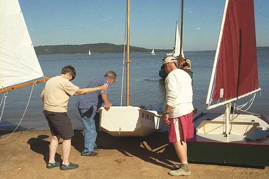 A nice trip for us. I suppose it took about an hour and a half to get there, all nice downwind sailing. But arriving at the beach you look back from where you came and see 6 miles of windward sailing and some whitecaps. Here is George taking the sail down on Mayfly16. The larger boats avoided beaching for the most part. The little guys usually pulled up on the beach and headed their boats into the wind.