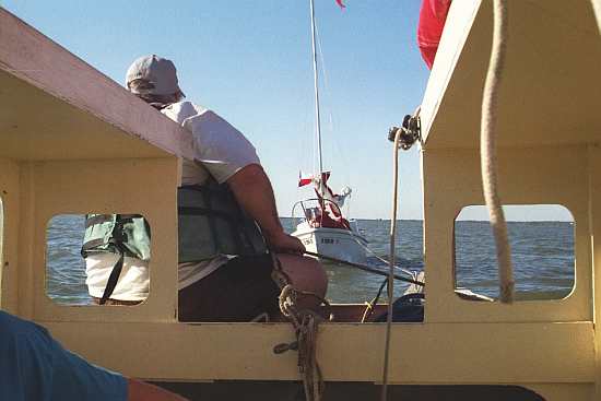 After a couple of hours we sailing more or less tack for tack with some other boats we noticed one of our fellows was getting left far behind, he had sort of made no progress into the chop in the hour that we were watching. Kathy said, "Maybe we should give him a tow." Going back to him would entail losing most of our to windward progress. "Then we could motor all the way back," says I. So we did that. He only had a trolling motor so we did the right thing.