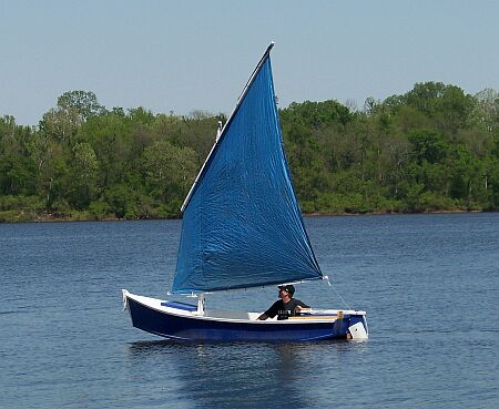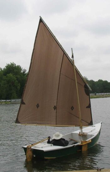 The sail rig is a balanced lug which is easy to build and stow. I recommend that my customers sew their own sails either from common polytarp (as Garth did in the boat shown above) or real Dacron sailcloth. The plans show instructions for sewing in real sailcloth. You need a sewing machine that sews zigzag stitches and cheap home machines are usually good at that. I don't claim to be the world's best sailmaker but it is not majic. I can do it and so can you. The clothes you are wearing are ten times more complex than a small sail. There are a few rules to follow and I give an essay on that with each set of sailboat plans. In fact I suggest you sew your sails before you build your hull. Both sail and hull require about the same work space. Sew the sail first, roll it up, stuff it in a closet, and now your workspace is ready for your hull. Getting the sail done can get you over a big mental hurdle.