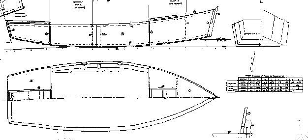 Mayfly14 is a straight forward flat bottomed plywood skiff for sailing and rowing. She's easy to build because her planks have no twists. That means that the chine log and wale bevels are constant for all practical purposes and can be presawn before assembly. The construction is of the simplest nail and glue variety with no building jigs or lofting required - an "instant" boat. The prototype was built by Garth Battista and kids in Halcottsville, NY.