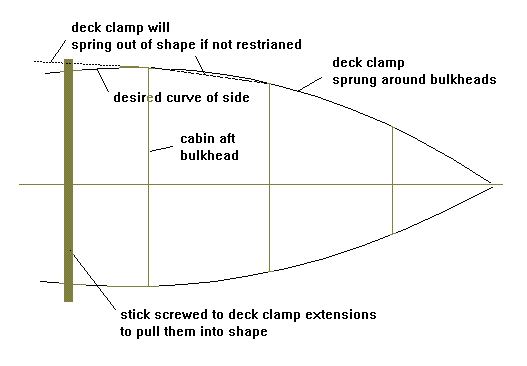 There is one trick to installing decks in cuddy cabins that I want to show. On many designs the deck "clamp", which is the piece of lumber that connects the deck to the hull, curves around the front of the boat and ends abruptly at a bulkhead, where the sides and wales continue in a smooth curve to the stern. If you were to install the clamp in the usual way and end it aburpty at the bulkhead as shown on the plans, you would find that it doesn't want to take the same curve as the sides! What has worked very well to correct the situation is to extend the clamps past well past the bulkhead into thin air, and then spring those ends inward with a cross stick. Like this: