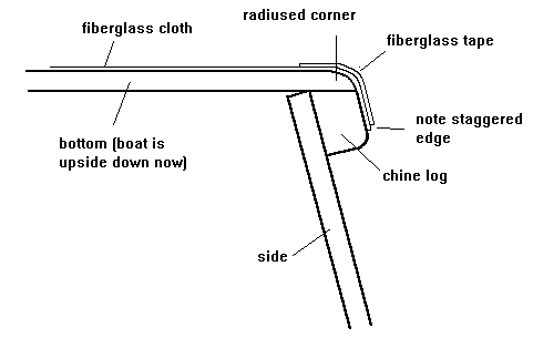 Carefully trim the out edges of the bottom panes flush to the chine logs and give the chine corners a good radius, at least 1/4" radius. A belt sander is a great tool for that job.