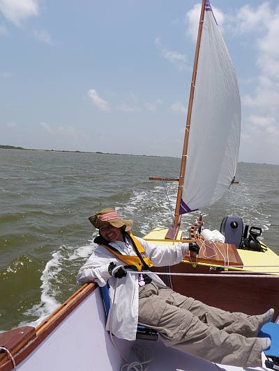 The line of fine bubbles following the boat in that photo means to me she was pretty much at or above hull speed, maybe planing. Also, note that the boat looks comfortable to the skipper, very important on the long stretches of the TX200. Someone sent this shot of the boat at that time and she is trying to rise up and plane. And note that the power of the coastal wind is such that you can get this speed in flat water with just a scrap of sail: