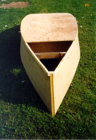 Update, 2012. John Goodman built the prototype. John is a very experienced builder and sailor which is a great thing for me. He found a few errors in the plans. The main flaw was in not allowing enough room between leeboard and hull with the result that the leeboard can at time bind against the widely flaring hull side. The simple fix was to make the leeboard guards wider. I fixed that on the drawings. There was another potential issue with the bevel given for the sides of the bow transom. John didn't agree with my number and supplied his own. I must admit I have rerun the space age rocket science vector analysis that I use to give the bevel and I keep getting the same wrong answer so I don't really know what to think. I have added John's bevel to the plans beside my own so you will have to assemble the parts enough to scope it out, never a bad idea anyway. There can be an explanation in this depending on where the bevel is measured.
