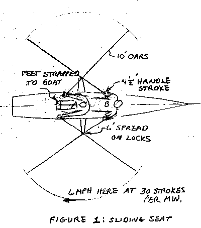 Figure 1 shows the usual sliding seat arrangement. Here the rower sits on a seat that slides on rails, his feet are strapped into shoes which are fastened to the hull. In position A, the start of the stroke, the oarsman has his arms extended and his knees drawn up such that his hands are near his ankles. By extending his legs on the power stroke at the same time as he pulls on the oars, the rower greatly increases the length of his stroke compared to a fixed seat. The seat looks to be sliding about 2' during the stroke. In the diagram he has about 4-1/2' of oar handle stroke, about a 50% increase over a fixed seat. If the cadence of the stroke is the same as for a fixed seat, a 50% increase in horsepower would result. (He might also pull with a lot more force on the handles, but remember all the force he generates will transfer through his arms and hands. So I wouldn't expect a large increase in handle force in a long run.)