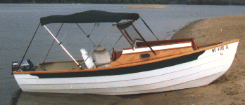 Three years ago Kilburn came to our June Messabout at Rend Lake with a powered model of a small power boat he was brainstorming. (Kilburn's model making has put him on the cover of some national model magazines.) I don't remember the exact details of the model but I think it was more or less of a lapstrake flat bottomed power skiff perhaps similar to a Simmons Seaskiff, about 20' long. It had a minimal cuddy cabin with a step through slot top similar in principal to Birdwatcher. It was long and narrow. Kilburn said it was a model of a real boat he intended to build. But the years and other projects slid by (including a very interesting mod to his Sea Pearl that I'll try to cover in a future issue) and the full sized cuddy power skiff stayed on the back burner. Even so, at that messabout Kilburn said he had already gotten a deal on an outboard that would fill the bill.