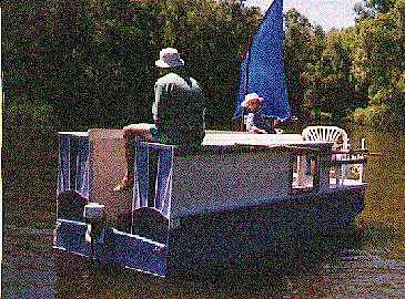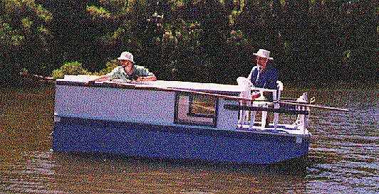 Harmonica was originally called Fusebox when it was in the catalog of prototypes. The prototype was built and renamed by Chris Crandall. Chris and his building partner David Unruh (1997/1998 Kansas Special Education Teacher of theYear) brought the Harmonica to our Midwest Messabout at Rend Lake in Illinois last June for its first showing and first launching. The prototype was built in Chris' rec room requiring the hiring of experts to remove the glass wall from the room to extricate the boat. The experts also carried the boat out of the room, one on each corner of the boat, before reinstalling the wall, confirming our guess that the boat weighed no more than 400 pounds.