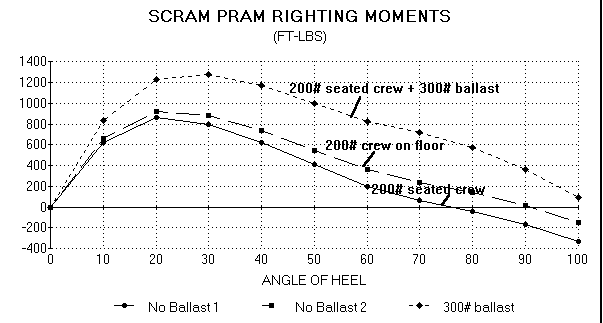 Lastly, I want to add that in another letter, Tim said that the righting ability of the Scram peaked at no more that 45 degrees of heel as determined by the force he had to use on the halyard while hauling the boat over.