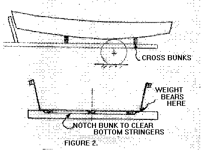 With the boat located fore and aft, we'll size up some custom bunks. I can think of three ways to support the typical rockered hull and none include the 2x4 longitudinal bunks that come with most trailers. See Figure 2. Here a flattie is mounted on two crosswise bunks, one forward and one aft, such that the weight bears only on the chines. The chine corners are very stiff and strong and nothing will happen to her.