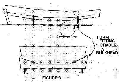 Look at Figure 3. Here a multichine is supported similarly, but with no hard chine to carry the load, she must be carefully cradled. The cradles should be located directly under hardpoints such as bulkheads to avoid deforming the hull. A V bottom hull with a lot of rocker should be supported the same way.