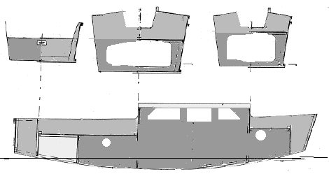 The sail rig is basically the same as Jewelbox's but here I've specified 300 pounds of inside ballast, minimum, that Jewelbox doesn't need. In spite of the invention of the Birdwatcher cabin, I don't think this older style of boat is obsolete. Many folks prefer the open sunny deck and the privacy of the separate cabin. This type hull might weigh 30% or 40% more than a equal Birdwatcher type but I don't know if that really matters too much. You can't tow something this size behind a small car anyway. The men who rate cars for towing aren't concerned with either vehicle longevity or the steepness of launch ramps.