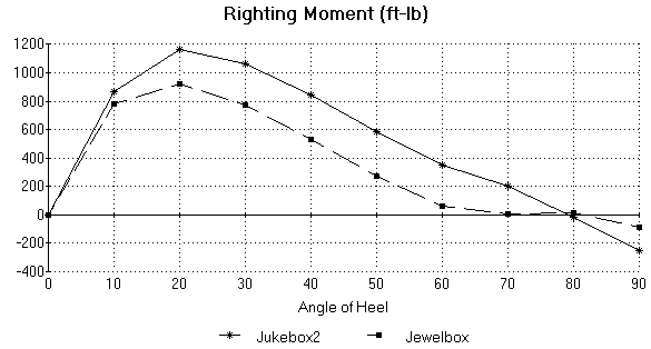 ...JEWELBOX... I think the fact that the Jewelbox righting moments are generally less than Jukebox's in the usual sailing range is mostly because she is about 30% lighter. If she were loaded with two more people and brought up to a weight about equal to Jukebox's I'd think she might be even stiffer than Jukebox. But the most valid comparison might be with the unballasted Jukebox which weighs the same as the Jewelbox. The advantage of the Jewelbox is that it won't flood and maintains a small righting moment past 80 degrees of heel.
