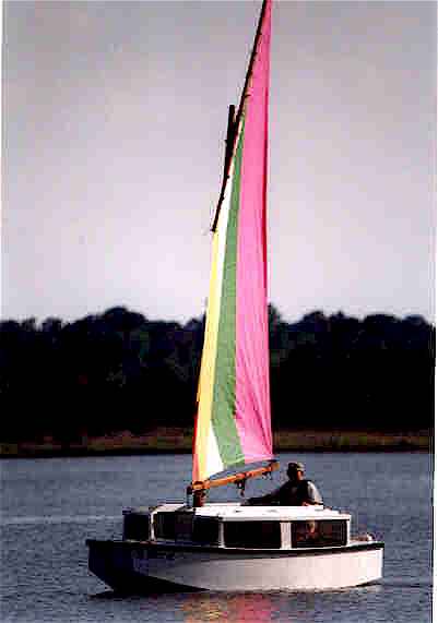 Wil wanted a very large sail rig, 173 square feet of balanced lug shown here. He and his wife sewed it up to the instructions given in the plans and they did an excellent job. It's a striped opus that must be seen in color to be appreciated. I always encourage my builders to sew their own sails but I must admit that one of this size might do you in. Some of the seams in the Scram sail are over 20' long so when you feed them through the sewing machine you need an awful lot of floor space. Wil sent a neat photo of the operation in his house, sewing machine in the hallway, room doors open on all ends of the hallway to accept the growing sail. I doubted that Scram needed so much sail but others have told me that in Houston's summer, it will all get used.