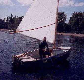 Skat: the prototype Skat builder is Roger Palaski. Up until now he was a mystery man know to me only as "Roger", his Skat plans bought for him by someone else. Then I find out he has his own web page with the Skat construction photos on it! Skat is a small somewhat traditional 12' cat boat with a gaff rig. Even has a centerboard, the only boat I've ever designed with one! See Roger's progress by clicking here.