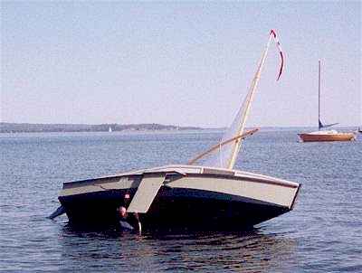 I put a lateen sail on Sneakerbox and didn't copy the original boomless sprit rig. The boomless rig would stow better but the lateen would easily outsail it and be much more likely to be rigged properly. What!! No pivoting leeboard?? This hull is too shallow to make one work well. I kept the traditional daggerboard. (Al has not built the sail rig yet, using the boat for recreational rowing.)