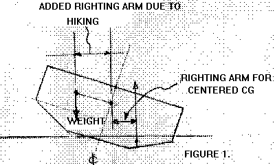 Take a look at Figure 1 which shows why hiking works so well. If the boat's overall CG is offset from centerline, that offset is added, to a certain degree, directly to the righting arm calculated by the stability program. I say "to a degree" because the added effect is actually the offset multipiled by the cosine of the heel angle. That would mean it is quite effective at small heel angles, drecreasing as heeling increases to the point where hiking has no benefit at 90 degrees of heel. (Unlike traditional ballast which is most effective at 90 degrees of heel.)