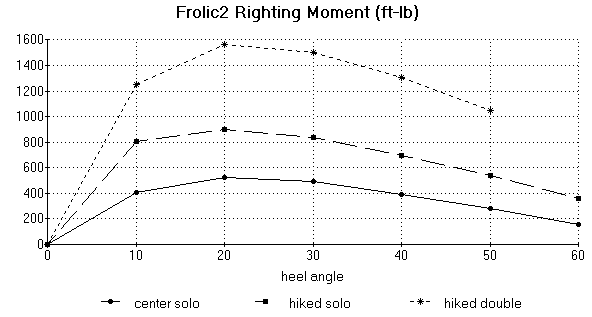In the last issues I looked at the effect of ballast on the boat's stability but limited things to having the CG on centerline. But the effect of a crew's being off the center of the boat, "hiking", can be significant even for mid sized boats like Jukebox and Jewelbox. Let's look at a couple of examples based on the new boat Frolic2 shown down in the featured boat section.