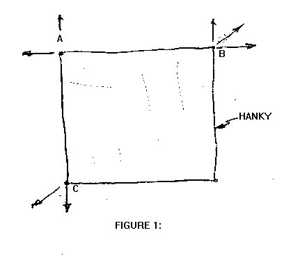 Now pull on it's corners from A to B. Mine stretches from 14" to 14.5" with a medium tug, about 3.5%. Now tug from A to C. Again mine stretches 3.5% with a medium tug. Now tug across the hanky diagonally from B to C. Mine stretches from 20" to 26" or 30%! I know that a hanky is pretty flimsy stuff but the real problem here is that the weave runs from A to B and from A to C and nothing is there to handle a diagonal load. Simple woven cloth (a lot heavier than the hanky) for sails for a long time because there was nothing else around. Sailmakers became wise to its stretchy ways and learned to deal with the problems of diagonal stretch. In particular when triangular sails became common (the squarer sails of olden days weren't as demanding) various ways of strenthening and shaping cloth became important. Sometimes you will see sails which are sewn in a radial pattern such that none of the cloth crosses the luff, leach, or foot at an angle.
