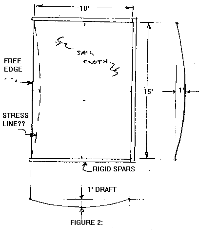 Here is a sample "sail" of 150 square feet. The width is 10' and it has 1' of draft which I have shown having its maximum in the center of the sail. The head, luff and foot are supposed to be secured to rigid spars. The leech is unsupported. In a way it is a gaff sail.