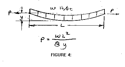 Figure 4 shows how something like a rope or wire or cloth will handle a side load. As with the rope discussion last issue, the deflection is the key. In this case we might assume no stretch of the fabric and a desired draft or deflection of 1' in the center of the 10' wide sail. If the pressure on the sail were 1 psf, as we showed it might be in a 14 knot wind a few issues ago, the end loading to support the wind load would be about 12 pounds per foot. It's hard to say it would be exactly that because in fact the stress is being distributed to all four sides of the sail, not just the luff and leech as this quicky check assumes. Essentially all of the tension in the sail is pulling inward to the center of the sail as far as the spars are concerned.