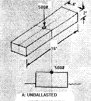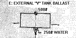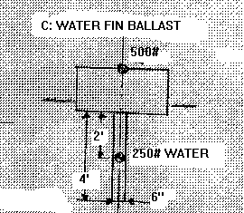 Example C has the same 250 pound fin configuration as example B except a water filled tank, 2' long, 6" wide, and 4' deep, is used instead oflead. That amounts to 250 pounds of ballast water centered 2' below the hull so the CG of the total boat/ballast combination is the same .66'above the bottom. Again, the 250 pounds of external ballast displaces some water. The water ballast displaces its own weight in water! So the ballast weight is exactly balanced by the buoyancy of the displaced water. So this underwater tank has no ballast effect as long as it is under water. When the boat heels enough to raise it out of the water, it becomes effective.