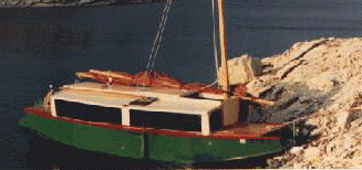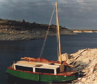 Here is a boat that is supposed to be self righting to a great degree without ballast! Jewelbox has the combination proven by Bolger's Birdwatcher of high sides with a thick bottom and low down crew weight to act as ballast. Karl James told me his boat has righted from having its windows totally submerged. Thanks to Tim Webber for the scans. The Texas grapevine reports the original boat has transferred hands as Karl has gone on to designing his own. No surprize there since Karl had told me of adventures with 5 different boats he had owned. His Jewelbox has been all over the country, including the Mexican trip shown in the photo above, and a lake/canal journey across the Florida peninsula. Here's the write up from my catalog....