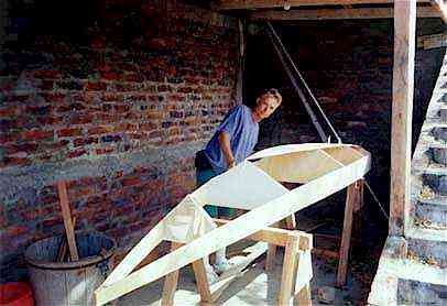 You might ask why I use beveled sticks on a taped seam boat. The answer is that I personally find it much easier to set up a boat initially with glue and nails to firmly establish its shape without relying on wired seams. The photo of Dale working on his Toto is the stage I'm talking about. If done this way the assembly, especially the sides to bulkheads and transom, is very firmly screwed and glued together without resort to messy resins which be used later in the actual taping of the seams. I think it's the easiest way and won't discourage anyone who thinks they have a better way.