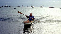 It's fun to compare Toto with the typical minimal dink because they usually come from the same pile of stuff and labor. Toto covered the 6000 foot long dam at Carlyle lake in 14 minutes with a moderate paddling effort for 4-1/2 mph. She's more seaworthy but she's wetter when pressed because of paddle splash. She has a buoyancy/storage chamber aft. It will keep your shoes and stuff dry while you splash around and I believe it has about 180 pounds of buoyancy volume if the hatch cover stays watertight. (But you can't "self rescue" in any boat like this without very special training. It's best to stay within a short swim or wade to shallow water.) The open cockpit is large enough to allow sleeeping inside, as I have done many times. She's shaped for easy cartopping. In good conditions she'll paddle two adults. The long lean bow seems to ignore an overload, unlike plumb bows which can become cranky when immersed. She'll take you through some very rough stuff if you are solo. But the dinks have their place too. They can have sailing stability and many will find their elevated seating more comfortable. By the way, a boat like Piragua with a simple wide flat bottom won't be as fast or as seaworthy as Toto, but you might be able to stand up in Piragua. Don't expect to do that in a boat like Toto.
