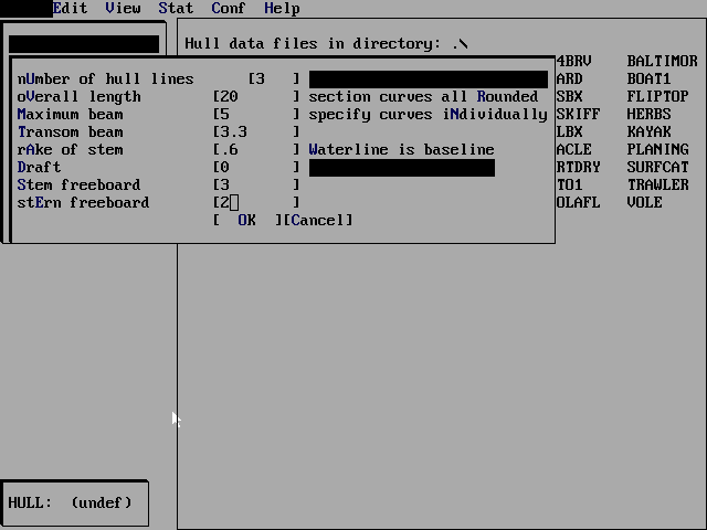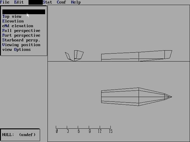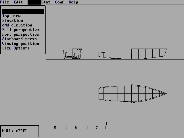 ...download the program, get into DOS, unzip it, and start the program "Hullform". Then select "File". If you select the "Open" entry you should find a bunch of sample boats put there by Peter Rye. Poke around there a bit to see what the program can do.