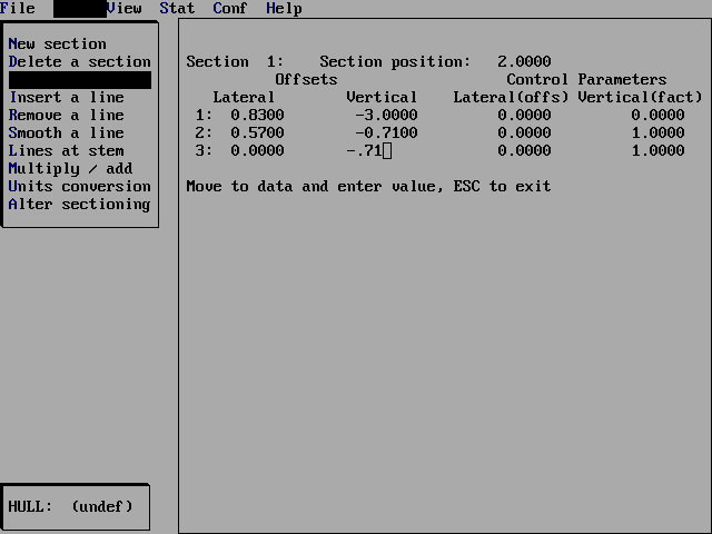 If you check the View now you will see not much has changed, only the stem moved aft making the boat a bit shorter. Next we have to input the dimensions of our AF2 one station at a time (which is why you need to design the boat first to the point of having a table of offsets). Select Edit, then New Section. It will ask you where to place the new section (in feet in this sample) at the same time showing you where the old sections are. For AF2 the next section will be at 2' so that value is entered. The program pauses a bit with a notice to select "Edit a section" to input values for the new section. Select Edit a Section. It will ask you which section to edit and you will tell it to select the new section (now called Section 1) and you need to tell it also to use a "text" edit instead of a "graphic" edit. That done it will show you this screen: