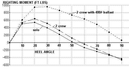 For the ballasted version the maximum righting moment is 960 ft-lbs. That would mean a maximum sail force of 80 pounds, or .7 psf for the 115 square foot sail. That corresponds to a wind speed of about 12 knots.