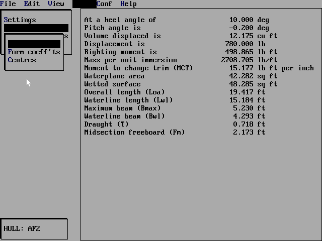 Crank up Hullforms again and select Files, then Open, and then your model. View it to make sure you've really selected your boat. Then select "Stat" and then "Settings". Here is what you see: