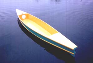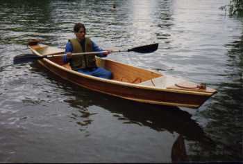 O'Hearn's boat followed very closely and he lives close enough that he brought the boat to our Messabout and I had a chance to try it myself. I thought it was quite good. I could just barely stand up in it, very common of this sort of narrow boat. It's 24" wide on the bottom and I've found that you can't reliably stand up in something that narrow. Don used the boat for fishing in little waters and keeps his butt on the seat. You paddle Piragua with a double paddle like a kayak. Here is Don's boat with his son at the paddle.