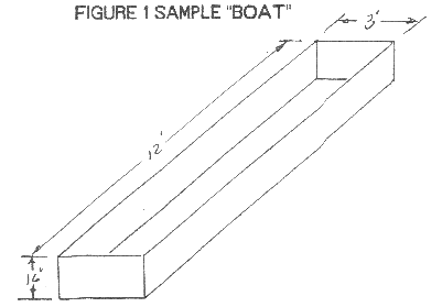 Figure 1 shows the "boat" I will use in the examples. It's not much of a boat but has the overall size of a small sailer. Its main attribute is that, being rectangular in every way, it makes figuring volumes in the coming examples very simple.
