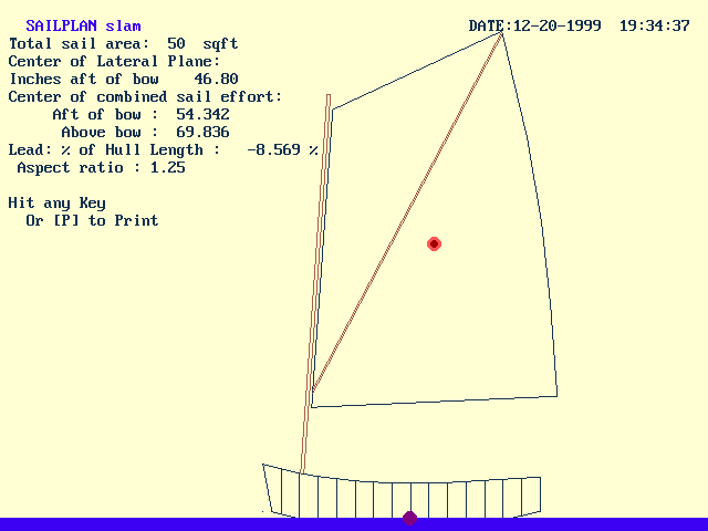 Next up is the Sail Design menu. I'm not an expert at this one but you can choose from a large selection of rigs and there are screens to lead you through it and ask all the things needed to dimension the sail rig. It responds with a picture with a lot of calculated data. Here is a resulting graphic for the the example boat:
