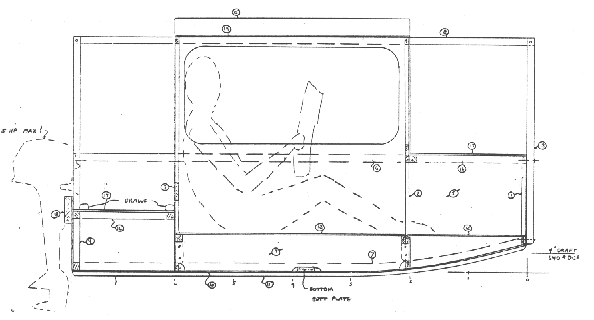 I might mention now that I think butt straps and plates should be well rounded at the ends to avoid trapping dirt and moisture. In boats that have taped seams I advise stopping the butt strap short of the edge of the panel so you will have room to run the tapes undisturbed. This is especially true of butt straps on the bottom. You must have a clear limber channel around the perimenter of the bottom. In that case I stop the strap about 1/2" short of the side, fill the little gap with epoxy to keep the water out, and tape over the bottom of the joint with glass tape and epoxy. Usually I don't put glass tape over the outside of the side panel joints. But butt joints in any deck should be well sealed with glass and epoxy. Here is an end view of the treatment: