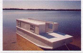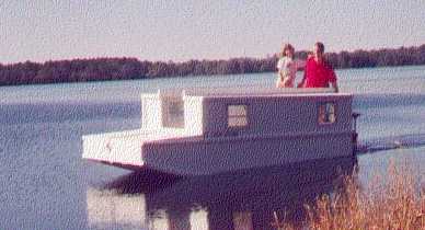Harmonica is a tiny shanty boat that sleeps two in its cabin. There is a porch up front suitable for lounging and a small room in the stern for the kitchen and the water closet. I think it is arranged so that two people could wait out an all day soaker without feeling too pressed. For protected waters only. I've been asked more that once if Harmonica would be OK in the Ohio River, etc.. My answer is no. In calm weather you might get away with it but you always run the risk of huge wakes, especially from large motor yachts. The prototype Harmonica was built by Chris Crandall of Lawrence, Kansas.