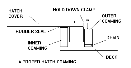 The ideal has a double coaming, one inside the cover and another outside the cover to delfect water as a first defense. The outer coaming has drain holes here and there to drain water that makes it into the slot. The hatch cover has a lip extending down into the slot between the two coamings, a rubber seal over the inner coaming, and a positive way to clamp the cover down hard.