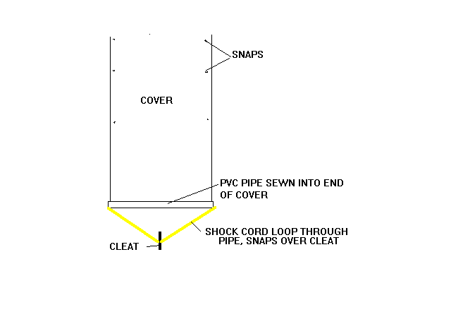 But wait a minute! If you make a fabric cover that snaps in place from the outside, how do you secure it from the inside? What I have done is to put the snaps in place so you can secure it all around from the outside, but the ends also have a small pvc pipe sewn in a hem with a shock cord loop running trough it. About 6" from the end of the walkway or door opening I put a small cleat or eye around which to snap the shock cord loop. To secure the cover from the inside, you snap everything except the last 2' or so, a space large enough to pass through. Then from the inside you grap the loop and snap it over the cleat. Like this: