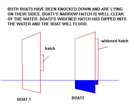 Boat 2 is the exact same boat but has its hatch widened a lot or placed off centerline. If the hatch is not water tight the boat will flood and the boat will founder (not "flounder" - even the National Geographic gets that wrong all the time).