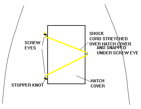 The cover is held down with a shock cord stretched over it. The shock cord "hardware" is actually small eyes screwed into the coaming. There are usually three eyes, two on one side of the opening to which the shock cord is attached simply by passing it through the eye and tying a stop knot to retain it there. The third eye is on the center of the opposite side of the hatch. The secure the hatch cover you simply stretch the cord over the cover to the third eye and snap it over the eye (no through it). From the top it looks like this: