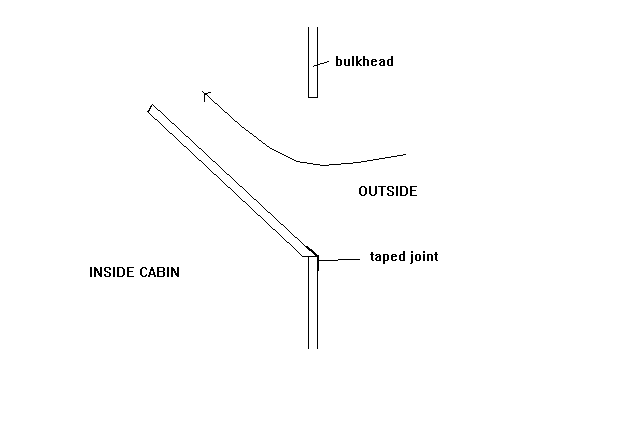 A few years back Bob Archibald stopped by with a Bolger Micro project he had found in New York. Very nice job, too. It was made from slick mahogany plywood and on his trip Bob had been stopped by someone who thought the unfinished Micro was a fancy hot tub! But I saw a problem right away. Where Bolger had placed a single vent on centerline on the aft bulkhead, the builder of this Micro had substituted two vents, one on each side of the bulkhead like this: