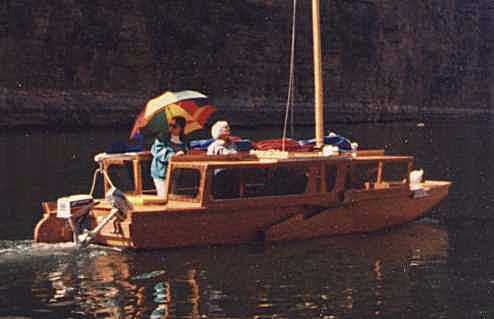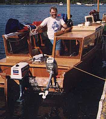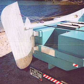 These features all worked very well! Pete said the offset rudder (the boat also has an offset mast and a single leeboard) made no differnce and that when sailing it you totally forgot that anything was offset. A 60 hp motor eventually arrived and the boat sped along at 20 mph full throttle and planed happily at 15 mph at part throttle.