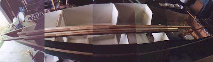 Are the ballast tanks worth the building effort? On a multichine hull like this the tops of the tanks form flats that give places for bunks and storage so that is good. When full the boat should have a very good range of stabiltiy. Chuck's boat has never been in rough going as I'm writing this so the effect of the ballast remains to be proven. It has been capsized in a practice but the ballast tanks were empty and the boat was empty with no crew, etc.. But the ballast is a success from the standpoint that Chuck is able to tow his Caprice behind a four cylinder pickup truck. My idea was to pull the boat up the ramp and drain the tanks afterward by simply pulling the drains plugs. But Chuck has found it best by far to empty the tanks before recovering the boat at the ramp. So he uses a bilge pump in each tank to pump them empty. I'd be worried about water ballast tanks on a wooden boat from a rot standpoint and would be careful to open all the plugs and access panels when the boat is stored.