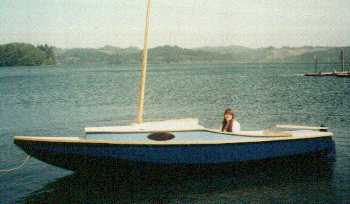 The Toto shape worked so well that I used it in other designs like Roar2 and RB42. I tried it also in a sailing boat, the 20' Frolic2 (the original Frolic was narrower, more of a rowboat than a sailboat). Frolic2 was unballasted with a small cuddy and I hoped it would be a good daysailer and one man camping boat. Two were built that I know of. They both went well but the design wasn't popular enough to stay in my paper catalog, although plans are still available for $35.