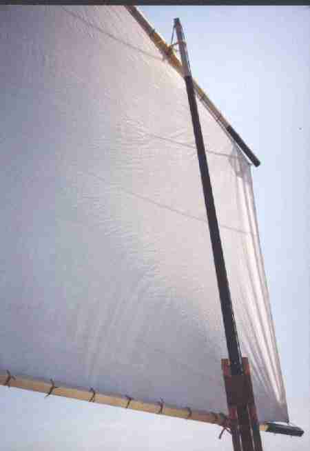 Normally I don't advise polytarp sails for boats that weigh more than about 500 pounds loaded and Caprice is way heavier than that. It will be interesting to see how it holds up! As for the shape, Chuck told me it sets perfectly no matter what he does to it.