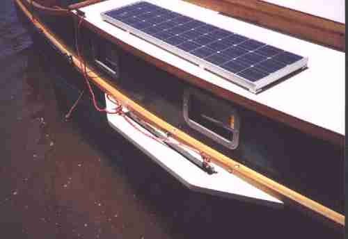 Chuck tells me it takes less than 15 minutes to rig the boat to as you see here. As shown the boat has its ballast so you see it beaches very well indeed. I asked about the ballast. He can flood the tanks without power, just open the access plate, reach in and pull the fill plug and let the water rush in. Since the tops of the tanks are about even with the normal waterline he has to move his weight around to keep the tank depressed long enough to completely fill. Then you reach into the filled tank, replace the plug in the bottom, and then replace the access plate in the top. There are two tanks to fill.